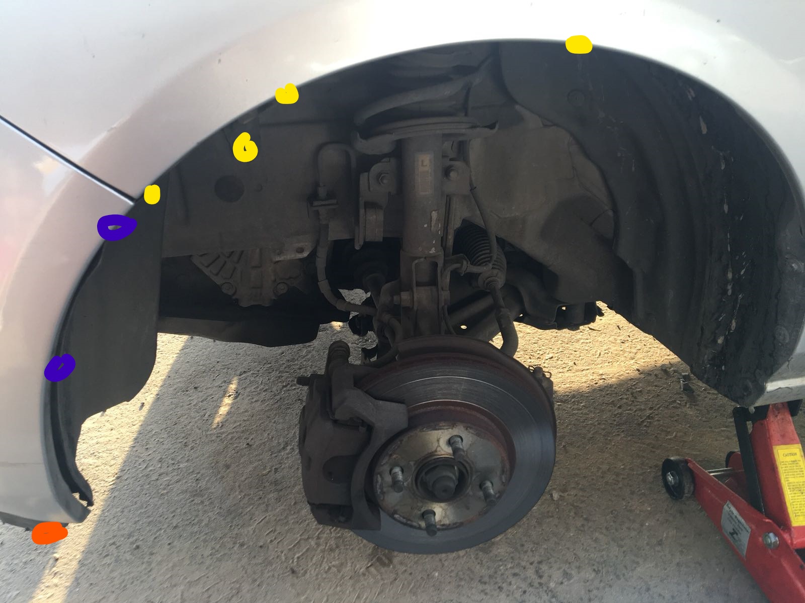 פתיחת 4 ברגים וקליפסים מפלסטיק בתא הגלגל (מסומנים בצהוב)