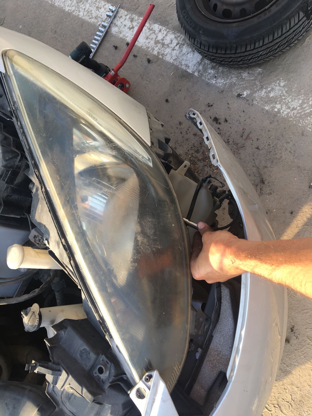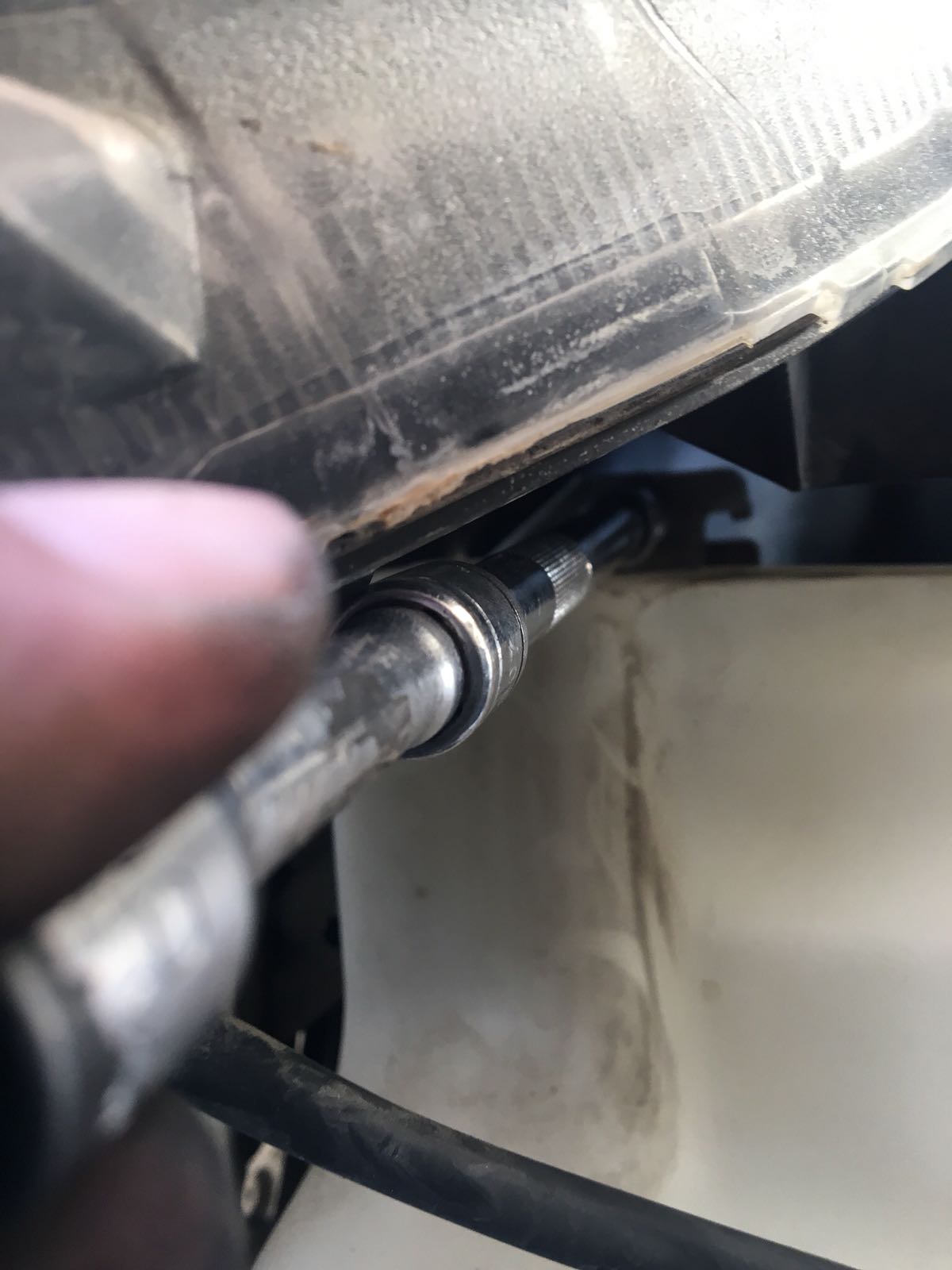 8. את הבורג העליון טיפה מסובך להוציא, הדרך הכי טובה היא לחבר (הסט הוא של בוקסות 3/8) מאריך ארוך+מאריך קצר+בוקסה 10 מ"מ ולהגיע אליו בקו ישר מתחת לפנס השמאלי.