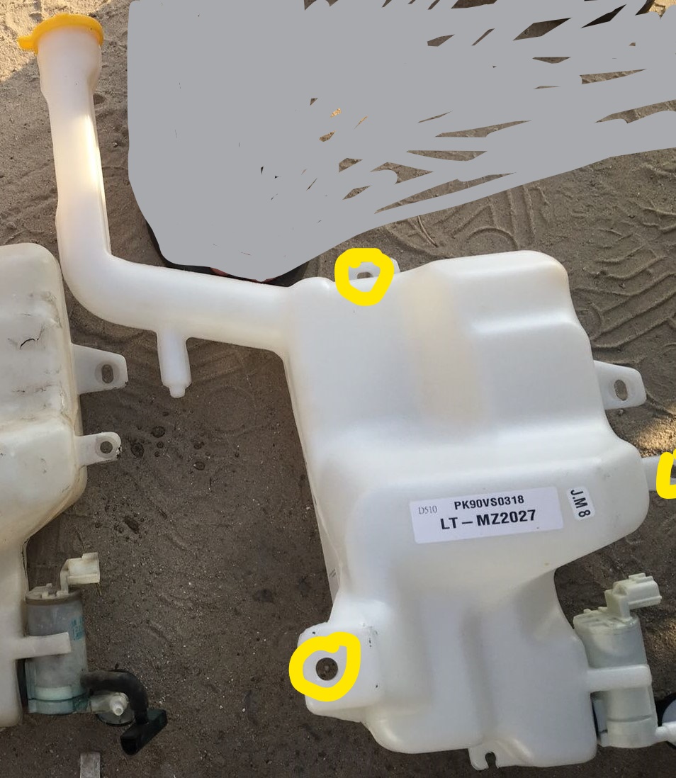 7. מיכל השמשות תפוס באמצעות 3 ברגי 10 מ"מ (מסומנים בצהוב). נפתח אותם באמצעות בוקסה 10.