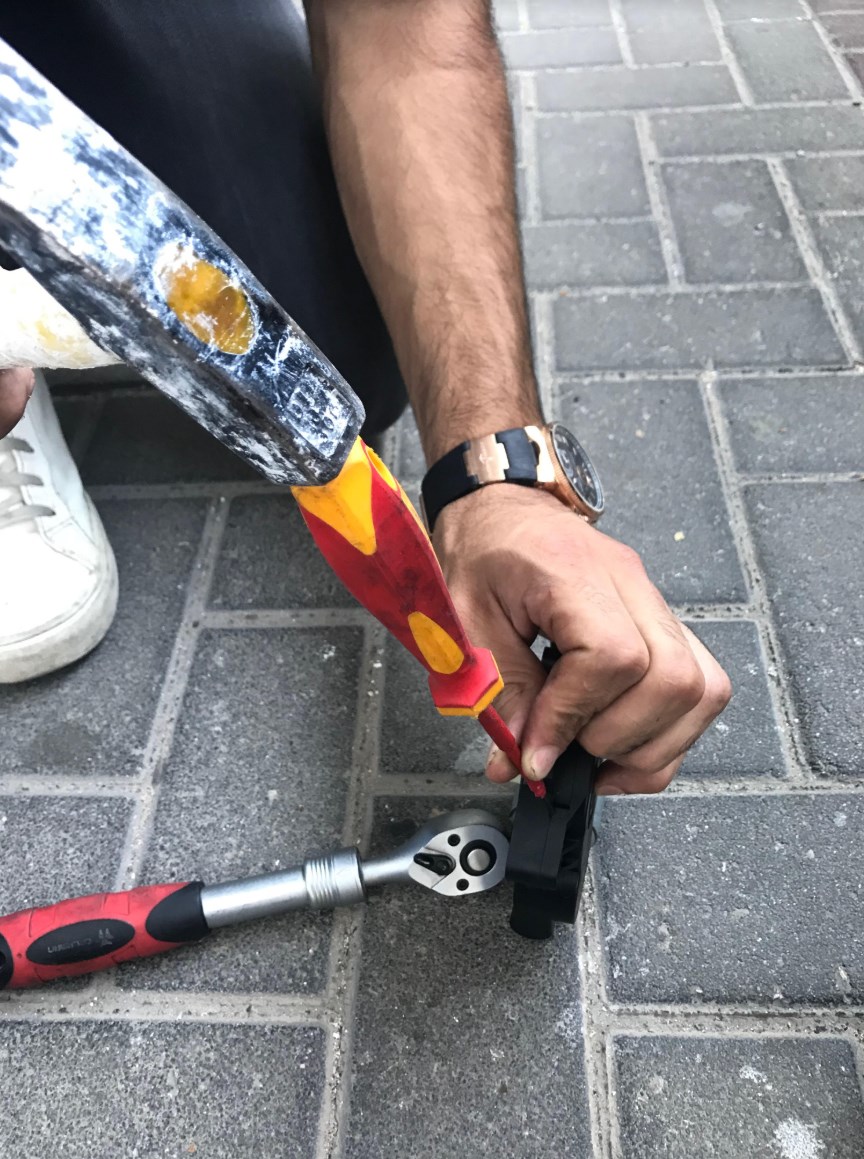אחרי שהמנוע בחוץ ניקח מברג שטוח ודק ונצטרך להפריד את הפלסטיק של המנוע, זה קצת קשה להכניס את המברג אז אני נעזר במכה קטנה עם פטיש: