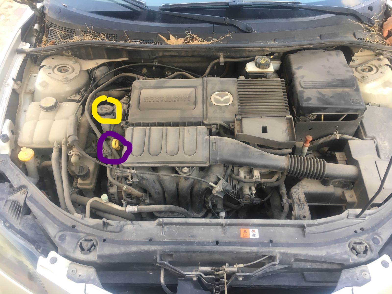 2. פתיחת פקק מילוי שמן מנוע (מסומן בצהוב) והוצאת מדיד שמן מנוע (מסומן בסגול).
