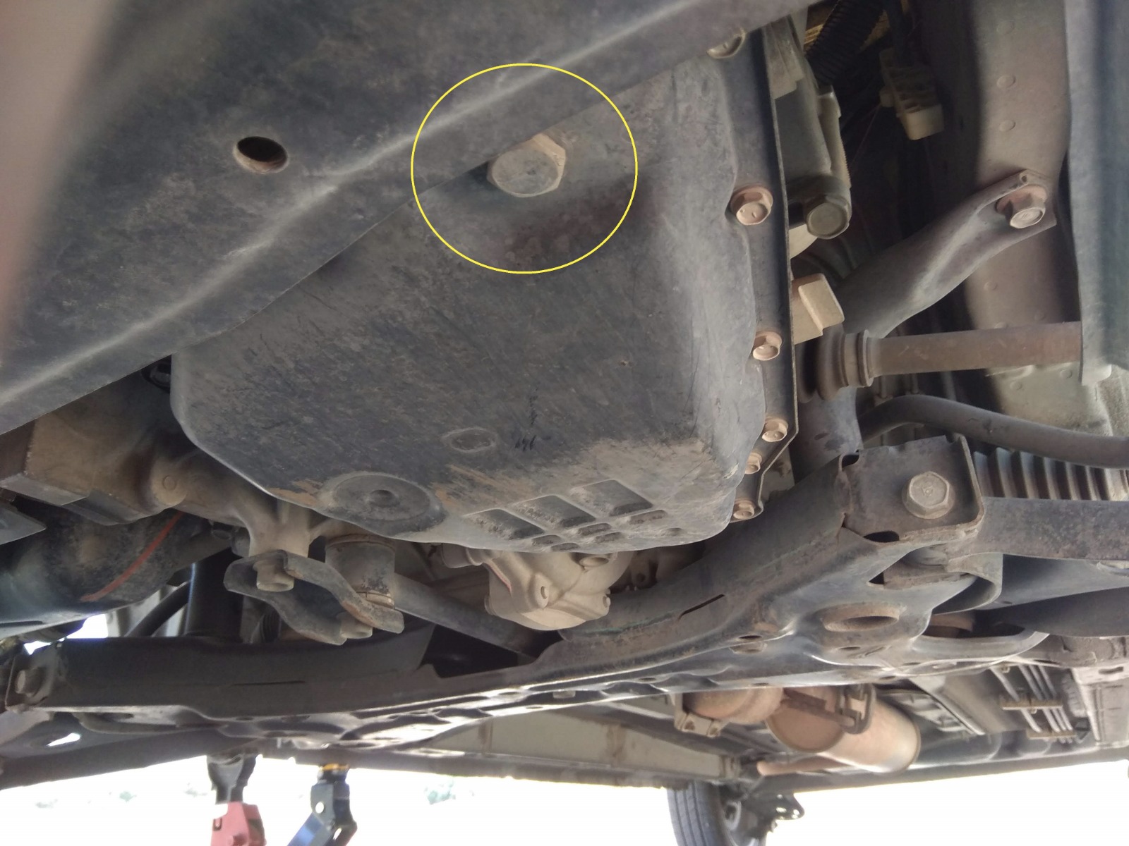 2. נאתר את בורג הריקון של נוזל ה-CVT. נמצא מתחת לרכב כמובן על יד הגלגל השמאלי הקדמי (צד נהג). בתמונה מסומן בצהוב. גם כאן קשה מאוד להתבלבל עם הבורג של אגן שמן המנוע שנמצא במרכז תא המנוע ומוצב בזווית לעומת הבורג של נוזל ה-CVT שמופנה ישר כלפי מטה. אפשר להשתמש בג'ק ולהרים קצת את הרכב כדי שיהיה יותר נוח למצוא את הבורג, אך את ריקון הנוזל עושים כשהרכב על הקרקע ולכן לאחר מציאת הבורג נוריד את הרכב מהג'ק