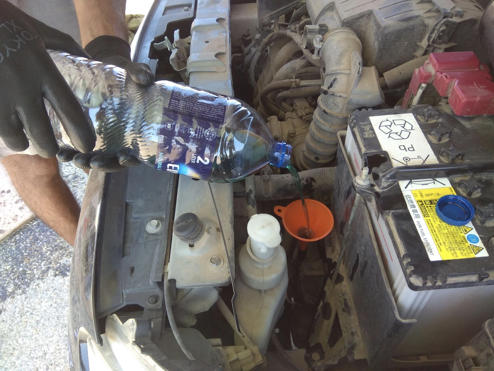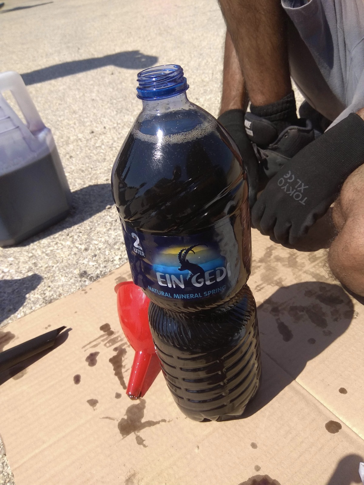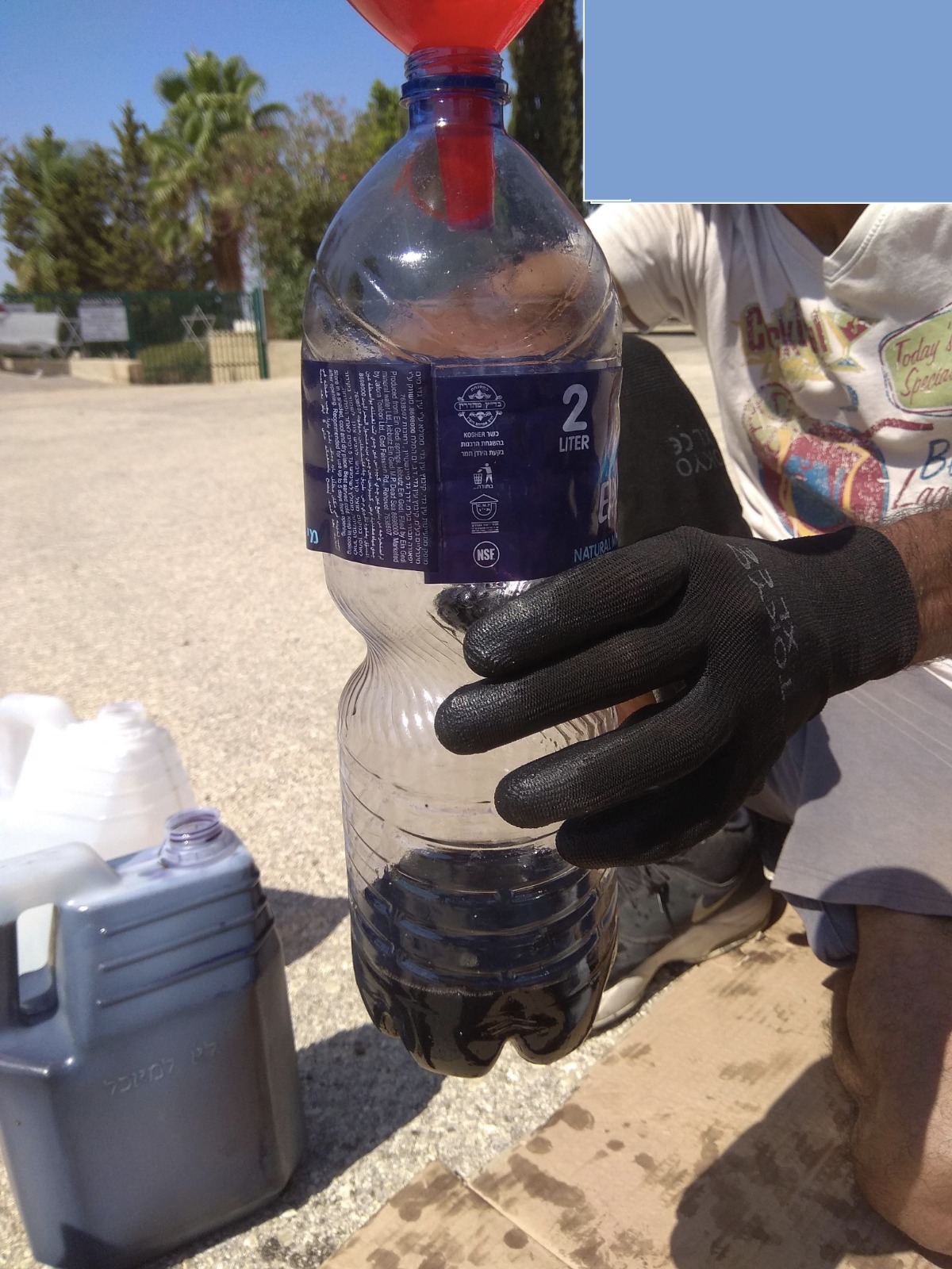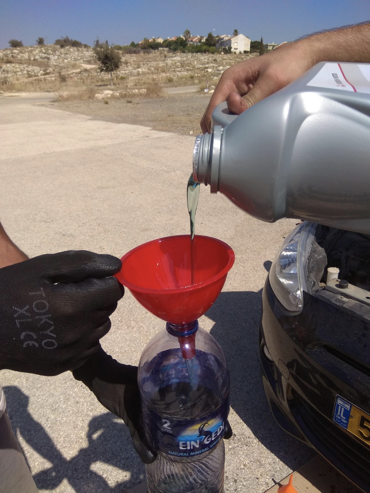 5. נבדוק כמה נוזל ישן יצא מהתיבה בשביל שנוכל לדעת בהתאם כמה להכניס – אני השתמשתי בבקבוק 2 ליטר של עין גדי ויצא לי בקבוק וקצת, את אותה כמות נמלא חזרה.