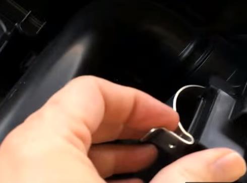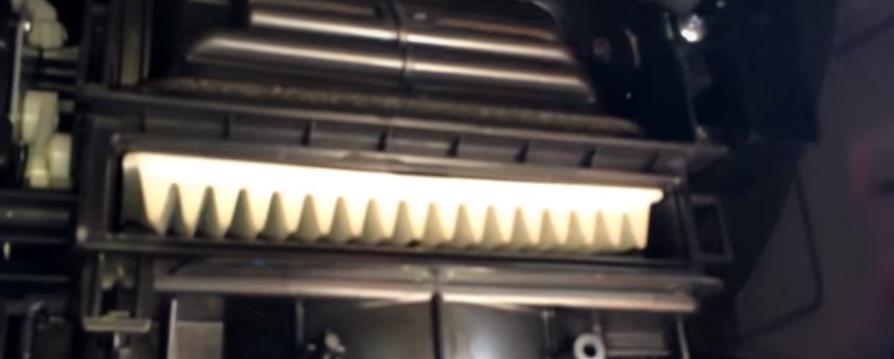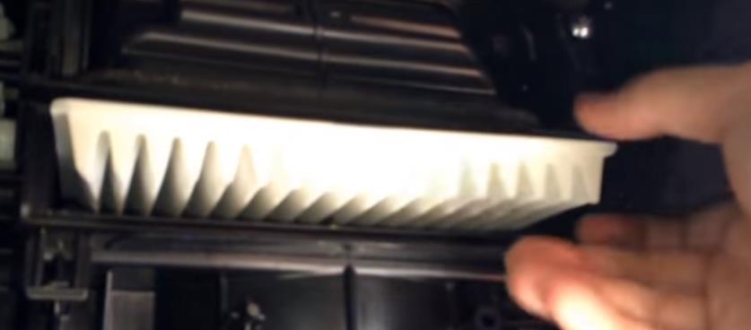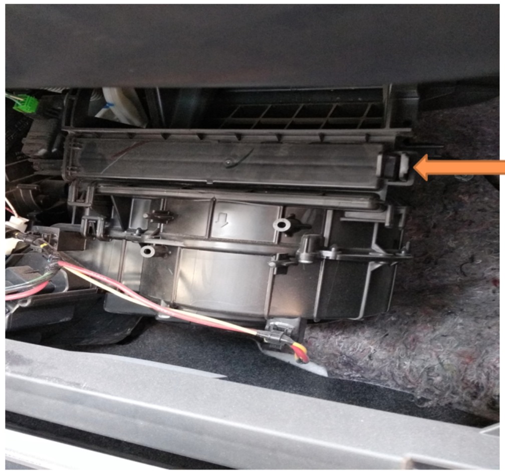 אחרי שהורדנו את תא הכפפות, מאחוריו בין היתר נראה את המכסה של המסנן. פותחים את הסוגר בצד ימין של המכסה, פותחים את המכסה מהצד הזה ומושכים ימינה, כך הוא יוצא לגמרי ורואים את המסנן הישן.