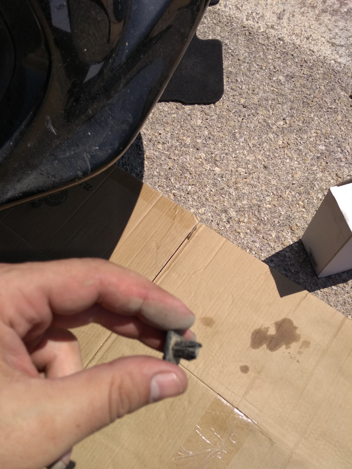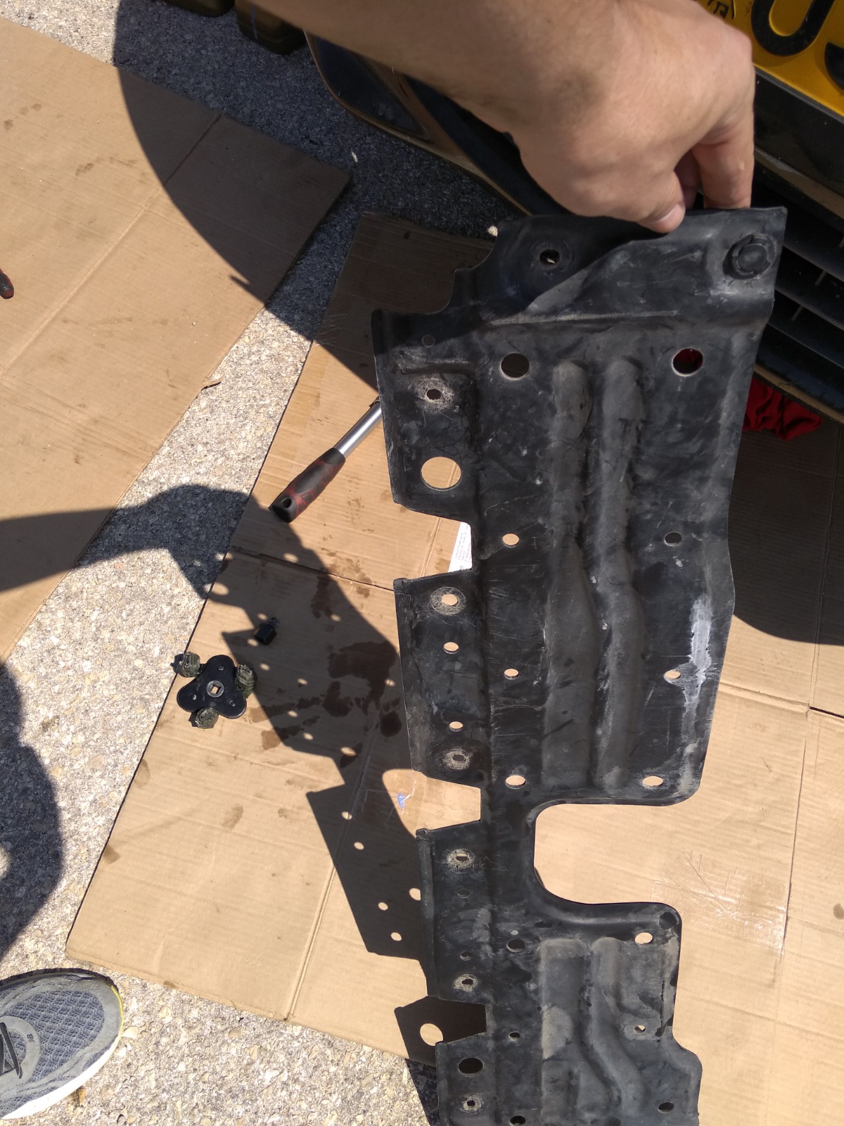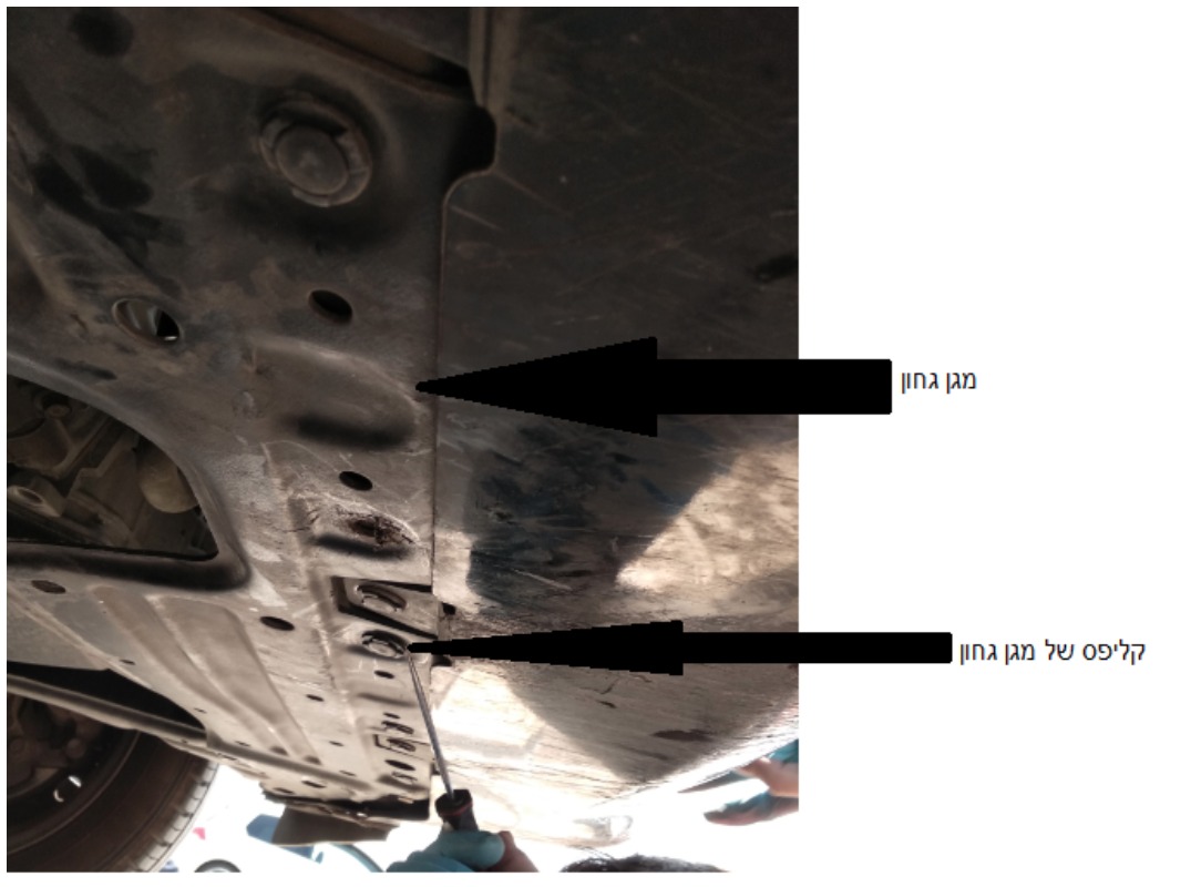 בעזרת מברג שטוח (או כלי ייעודי לחילוץ קליפסים) מוציאים את הקליפסים המחברים את מגן הגחון לאוטו. מכניסים את החלק השטוח של המברג מתחת לקליפס ומחלצים אותו. יש עוד קליפסים של חלק פלסטיק אחר באותו איזור, יש לשים לב שאנחנו לא מוציאים אותם אלא רק את אלה של המגן גחון.