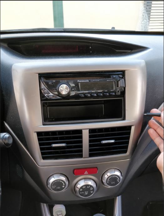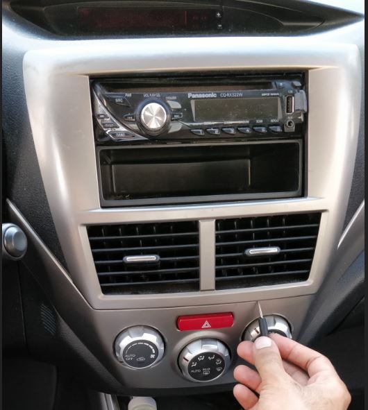 מתחילים בהוצאת הפנל הכסוף שמקיף את המערכת ואת פתחי המזגן. דוחפים מברג שטוח באחד מהצדדים איפה שיש רווח שהמברג נכנס לתוכו ומפרידים את הפנל מהרכב.