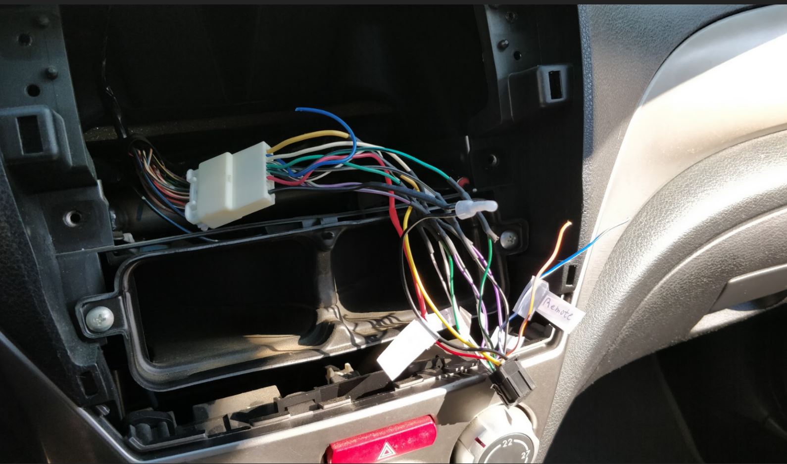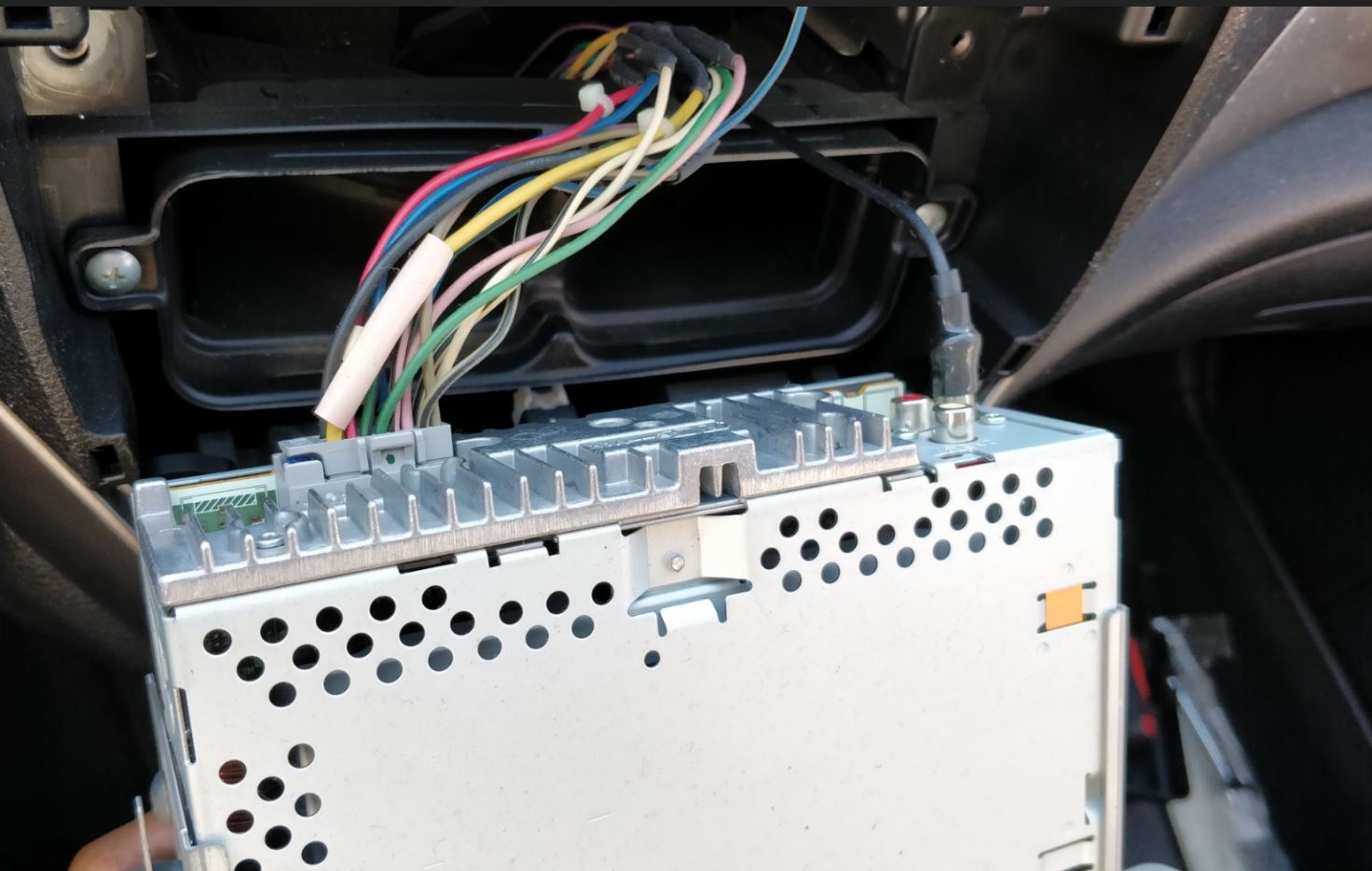 עבודה הסתיימה. כל מה שנשאר לעשות הוא לחבר את המערכת החדשה ולהחזיר הכל למקום. צילמתי את החיבורים של המערכת החדשה שתראו, בגדול הכל נראה די דומה ואין איפה להתבלבל. אל תשכחו לחבר את הכבל אנטנה לשקע שלו במערכת (צד שמאל בתמונה), אני שכחתי ולא הבנתי למה הרדיו לא עובד 🙂 בהצלחה!