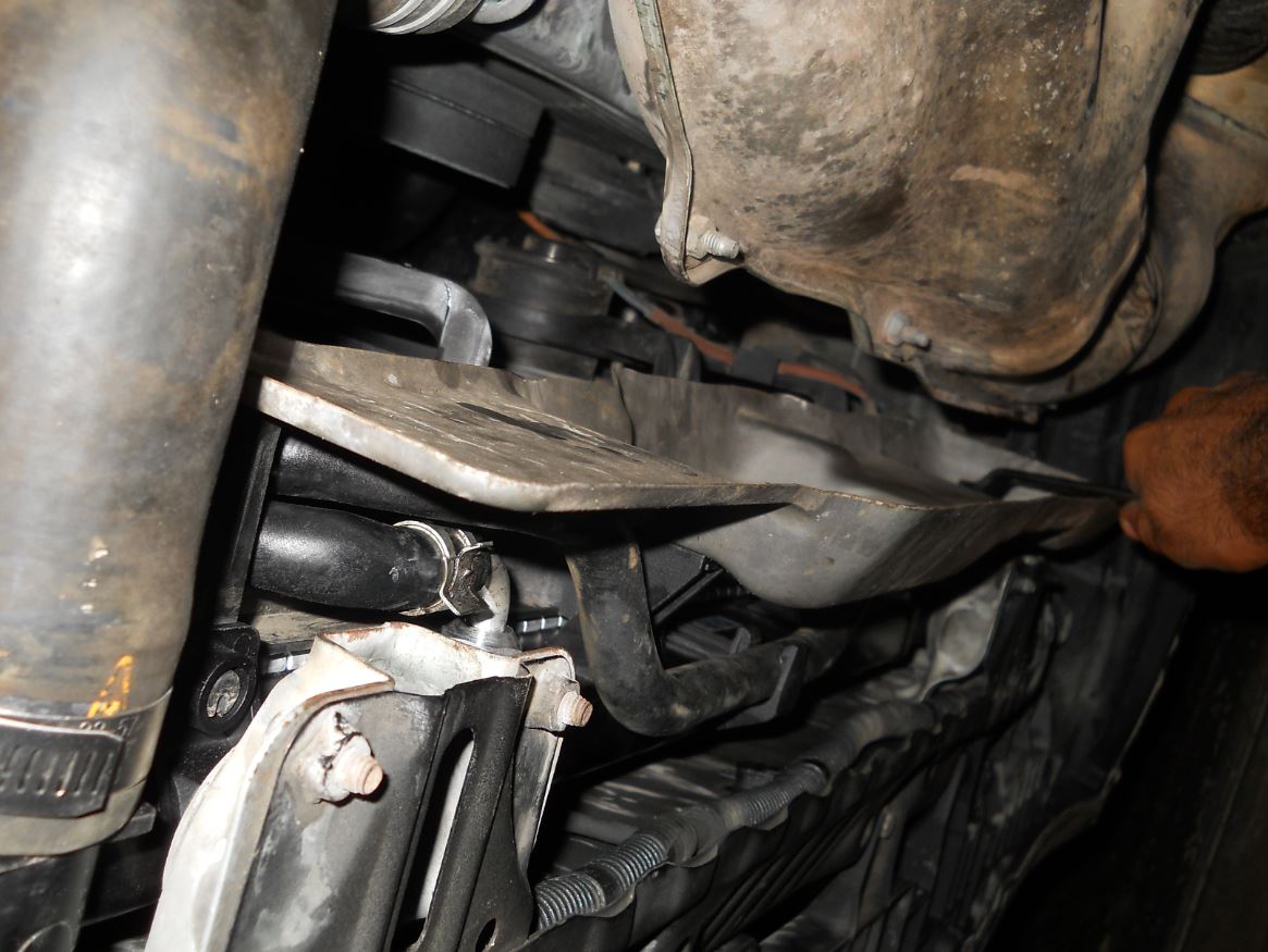 מוציאים את מגן החום שנמצא בין הרדיאטור לצנרת הפליטה. 2 ברגי 10 מ"מ והוא בחוץ. הגישה מעט צפופה, רינג זוויתי מאוד יעזור למי שיש