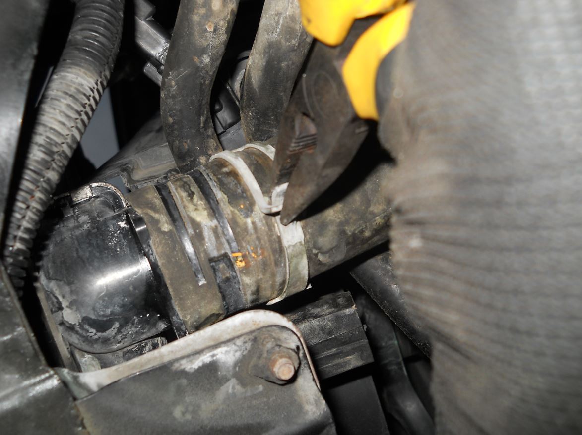 עוברים לניתוק צינורות קולר הגיר מהרדיאטור. בעזרת פלייר תופסים את הבנדים שלהם ומרחיקים אותו מנקודת החיבור. הצינור עדיין תפוס מאוד חזק, דחיפות עם מברג שטוח (בזהירות לא לפגוע בצינור)