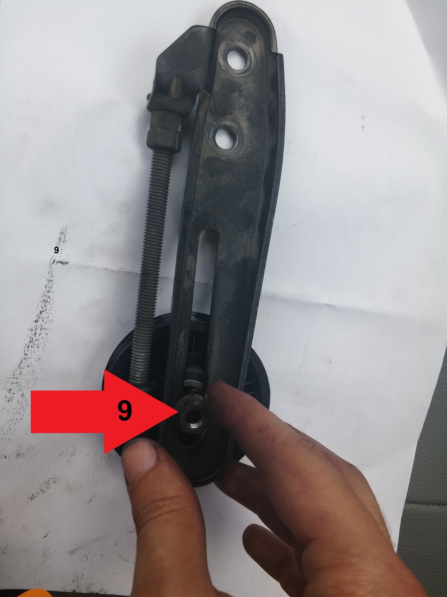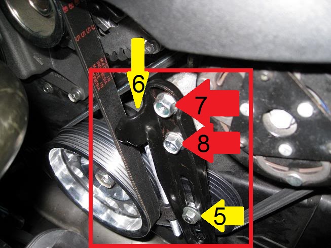 10. כעת ניקח את כל המותחן עם הגלגלת החדשה שהרכבנו ונחבר אותו למקומו על ידי חיבור הברגים 7+8, המומנט הוא 36NM לעליון (בורג מספר 7) ו 23NM לתחתון (בורג מספר 8).