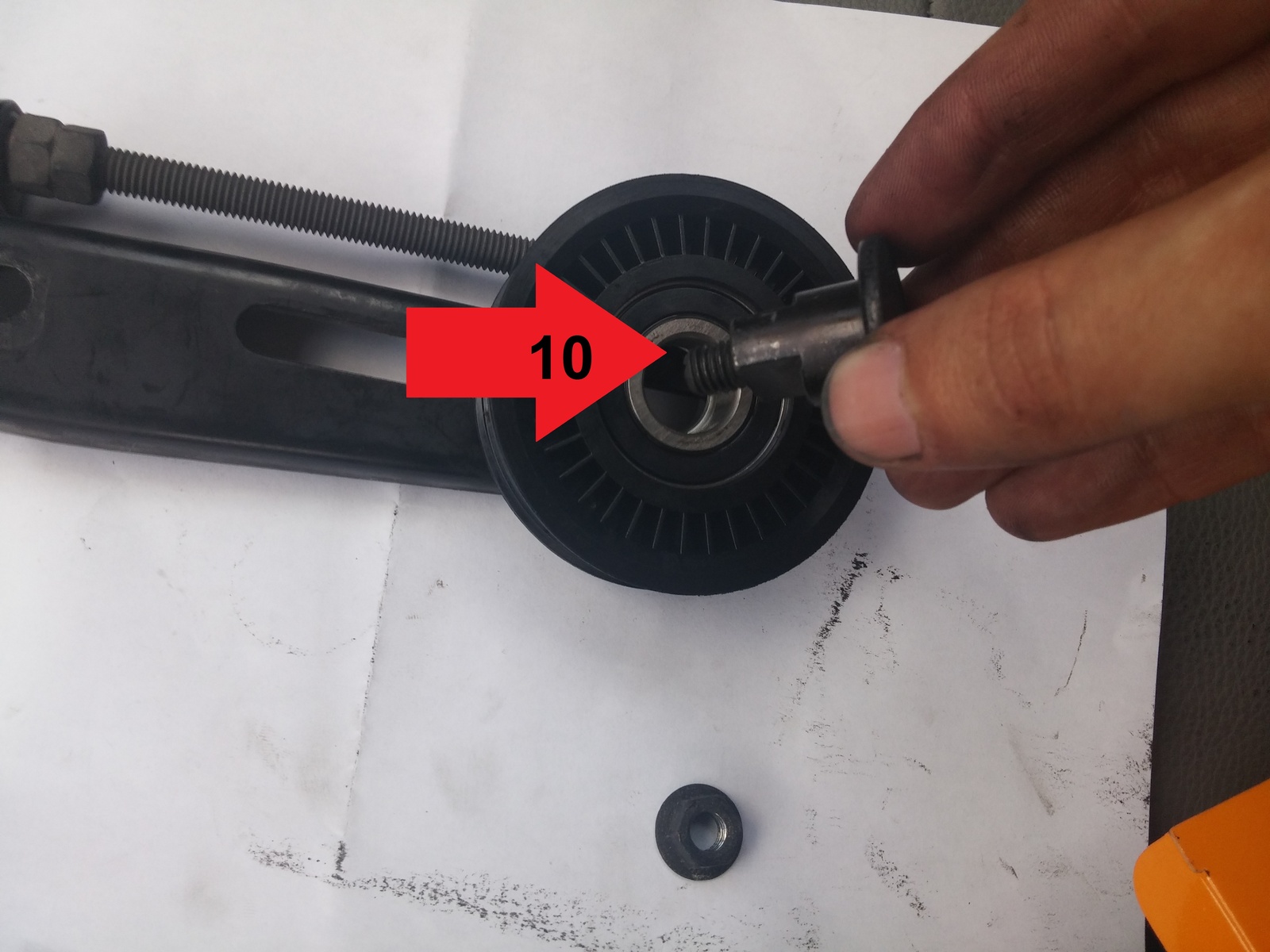 8. כעת כשכל המותחן בחוץ, נהפוך אותו ונבריג החוצה את האום שתופס את הגלגלת (9) ונוציא את הבורג מהצד השני (10).