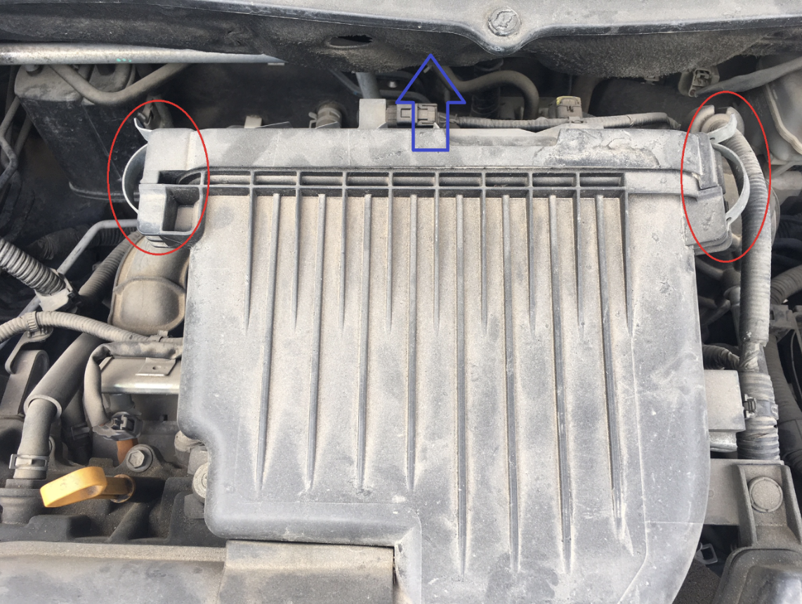 לאחר מכן להזיז בעדינות את מכסה פלסטיק המסומן בכחול קדימה כפי שמצוין בתמונה למעלה ולהוציא את הפילטר אוויר הישן מעלה בעדינות.