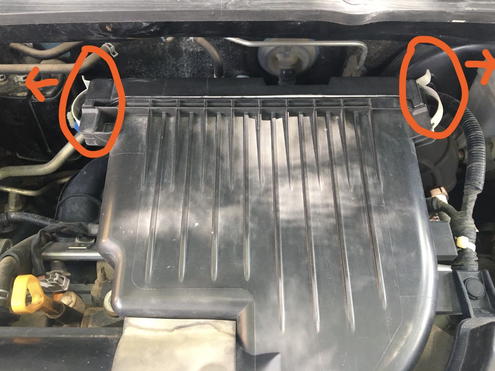 2. פתיחת 2 קליפסים ממתכת הסוגרים את בית פילטר האוויר (מסומנים בכתום).