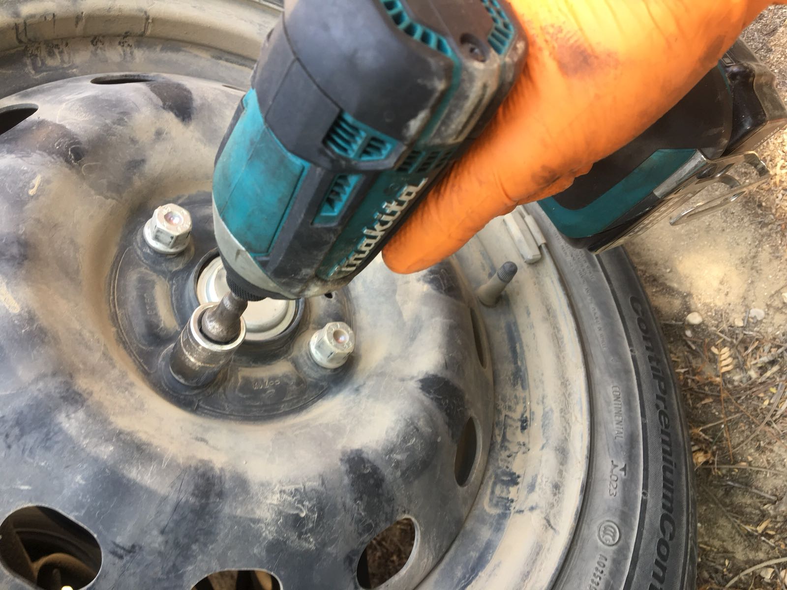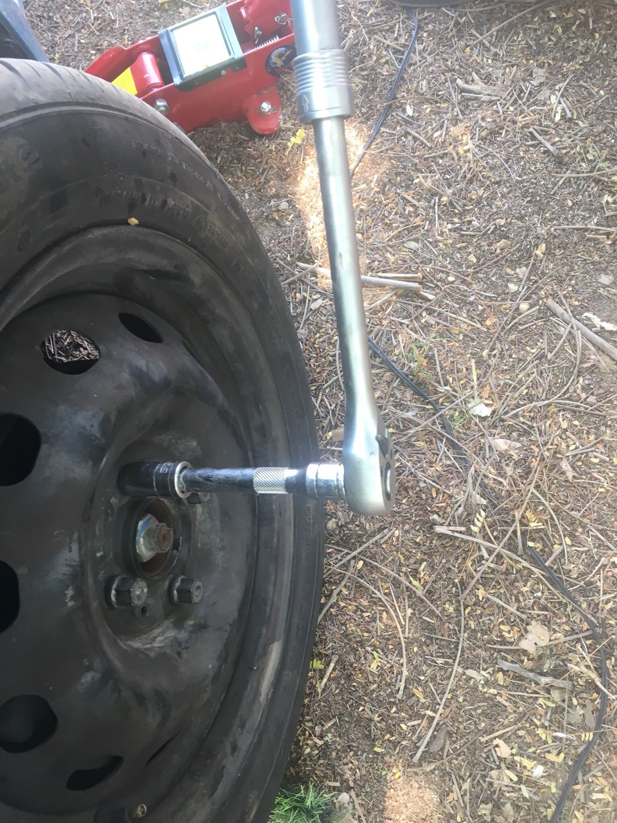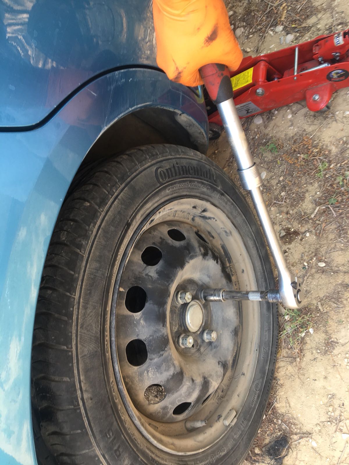 3. שחרור הברגים עם ידית כוח, הרמת הרכב עם ג'ק ואבטחה עם בוק, משיכת כיסוי הגלגלים, הברגה החוצה של הברגים באמצעות בוקסה 17 מ"מ והוצאת הגלגל.