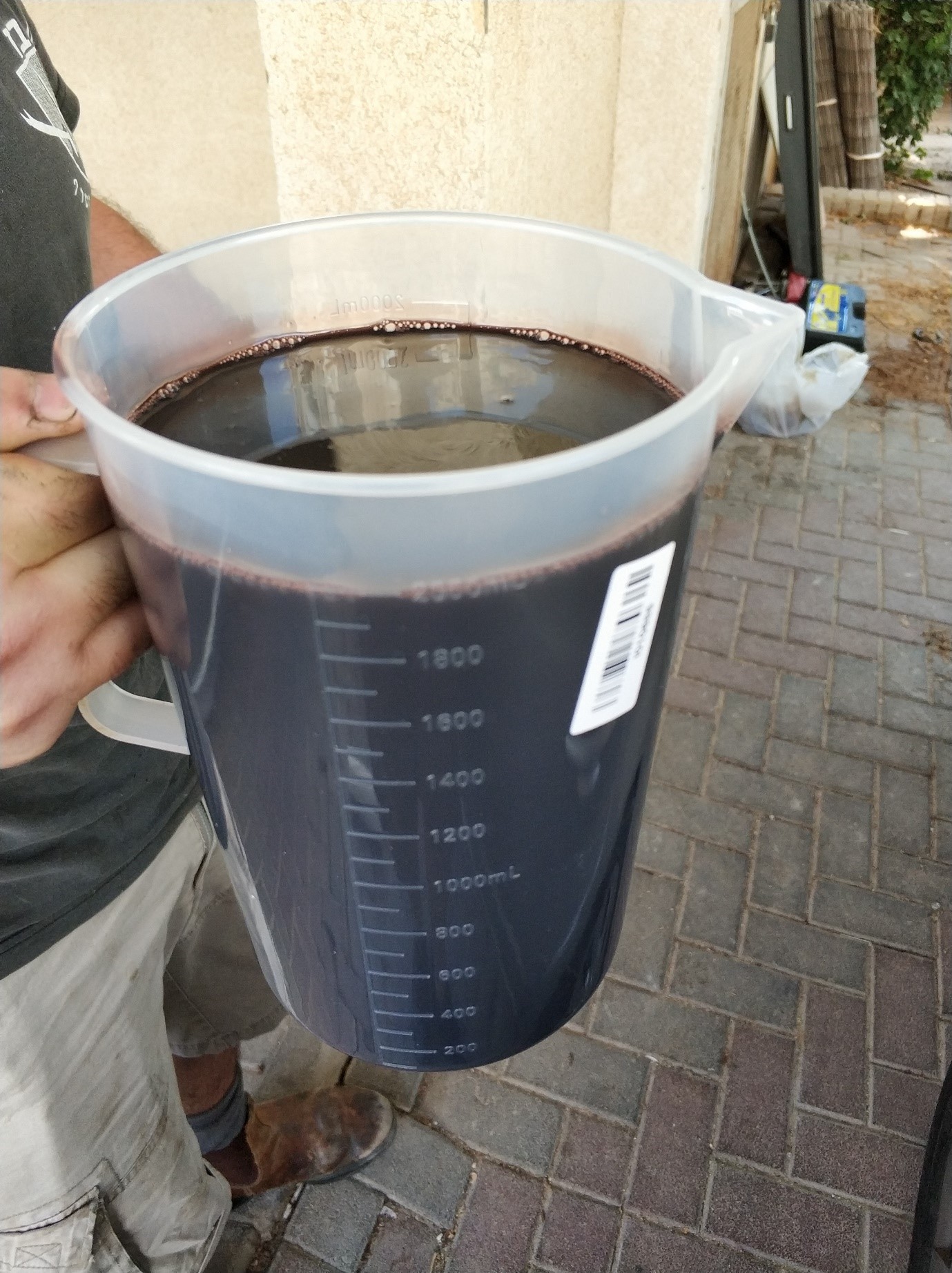 אחרי שהנוזל נשפך העברנו אותו למיכל מדידה של 2 ליטר כדי לדעת את הכמות המדויקת שיצאה.