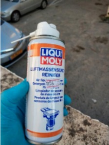 נוזל ניקוי מד כמות אוויר (MAF SENSOR CLEANER). בשום פנים ואופן לא נוזל ניקוי קרבורטורים – ראיתי תמונת מיקרוסקופ בה רואים שזה ממש מעוות את החיישן. ואפילו נוזל בלמים לא מומלץ. אני השתמשתי בליקווימולי אבל יש גם ל-CRC ול-BG מוצרים דומים.