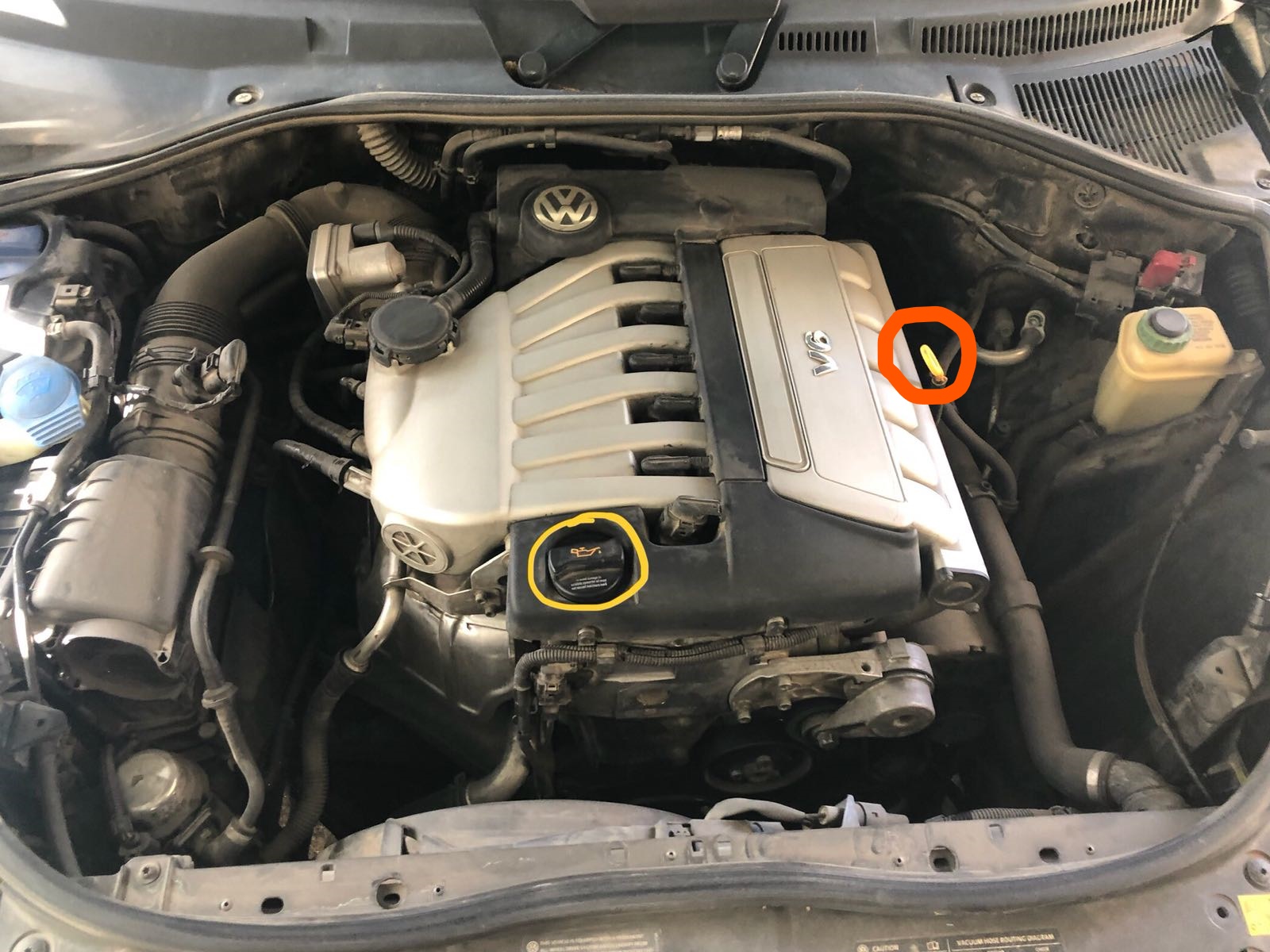 2. פתיחת פקק מילוי שמן מנוע (מסומן בצהוב) והוצאת מדיד שמן מנוע (מסומן בכתום).