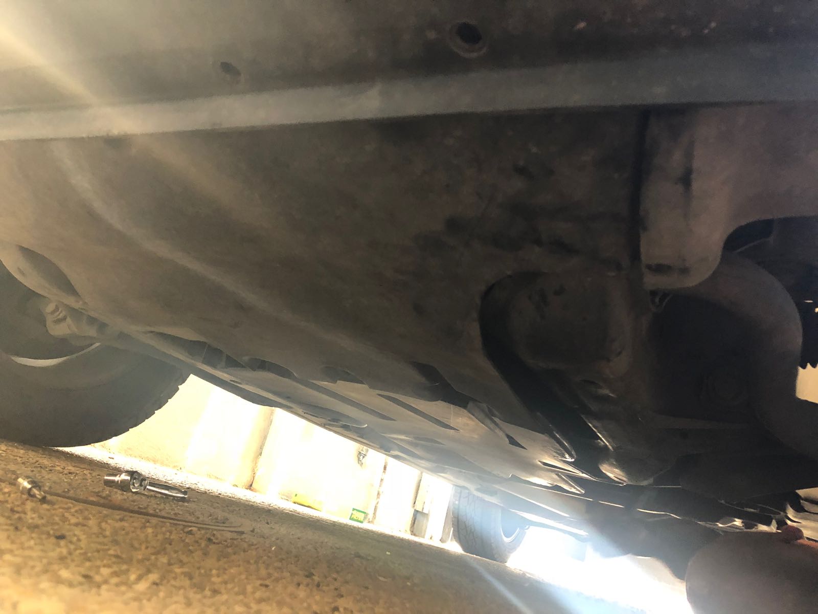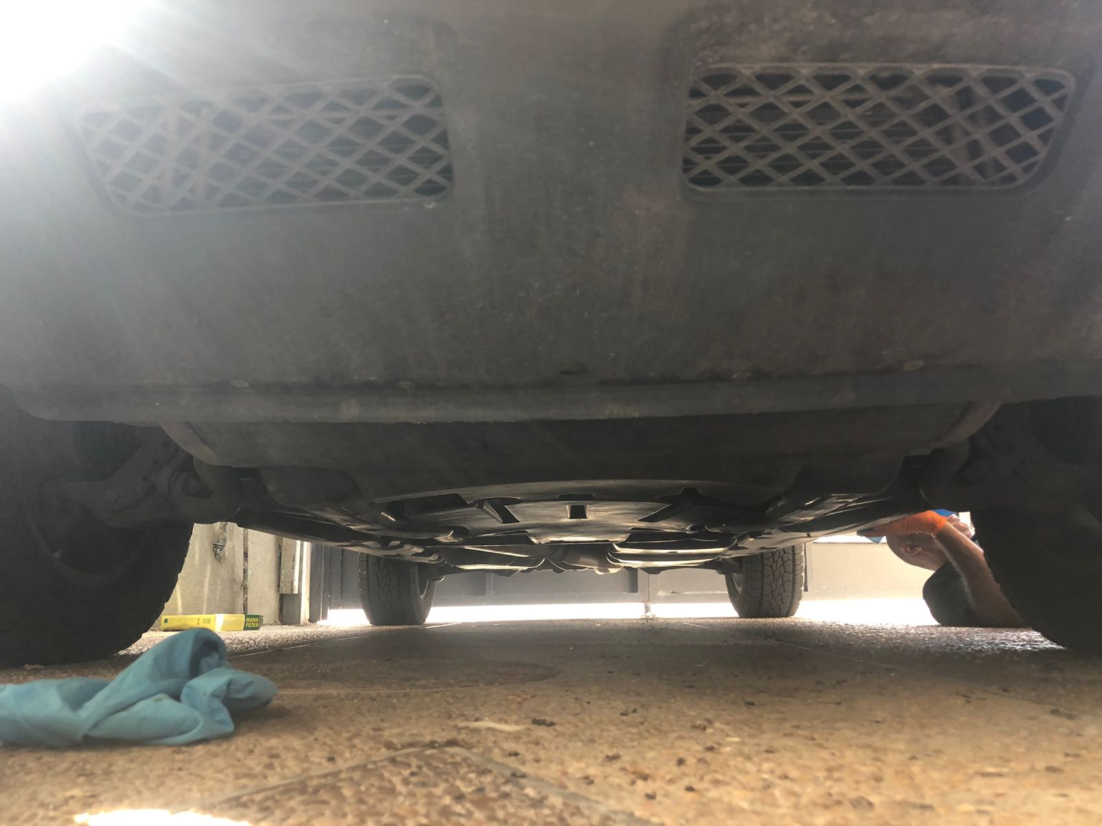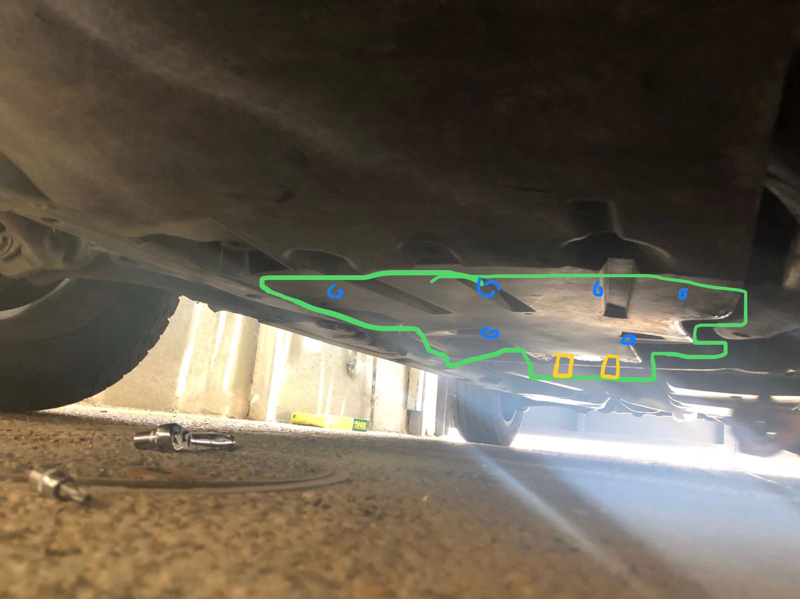יש מיגונים נוספים בתחתית הרכב ויש לשים לב שמורידים רק את המיגון האמצעי (מסומן בירוק).