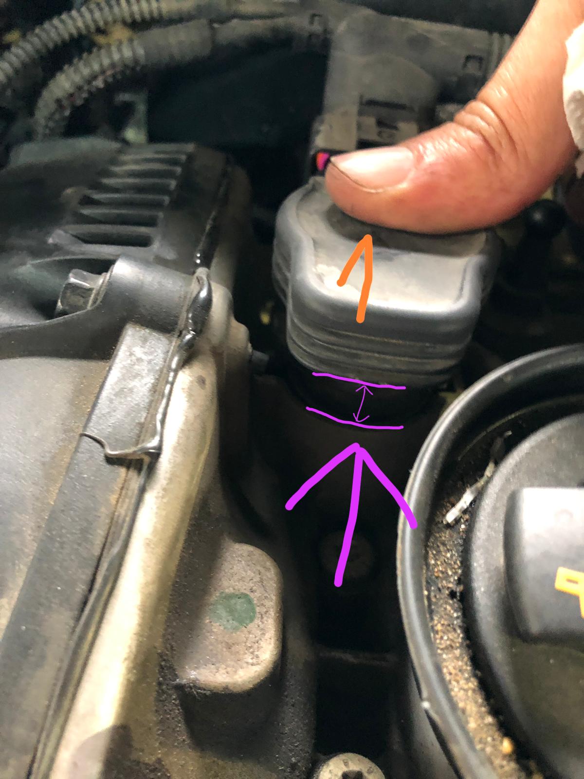 10. לאחר מכן נחזיר את סלילי ההצתה למקומם. שימו לב שיש ללחוץ על ראש הקונקטור על ששומעים "קליק" כשהסליל מתחבר לפלאג והמרווח (מסומן בסגול) בין הסליל למנוע נסגר.