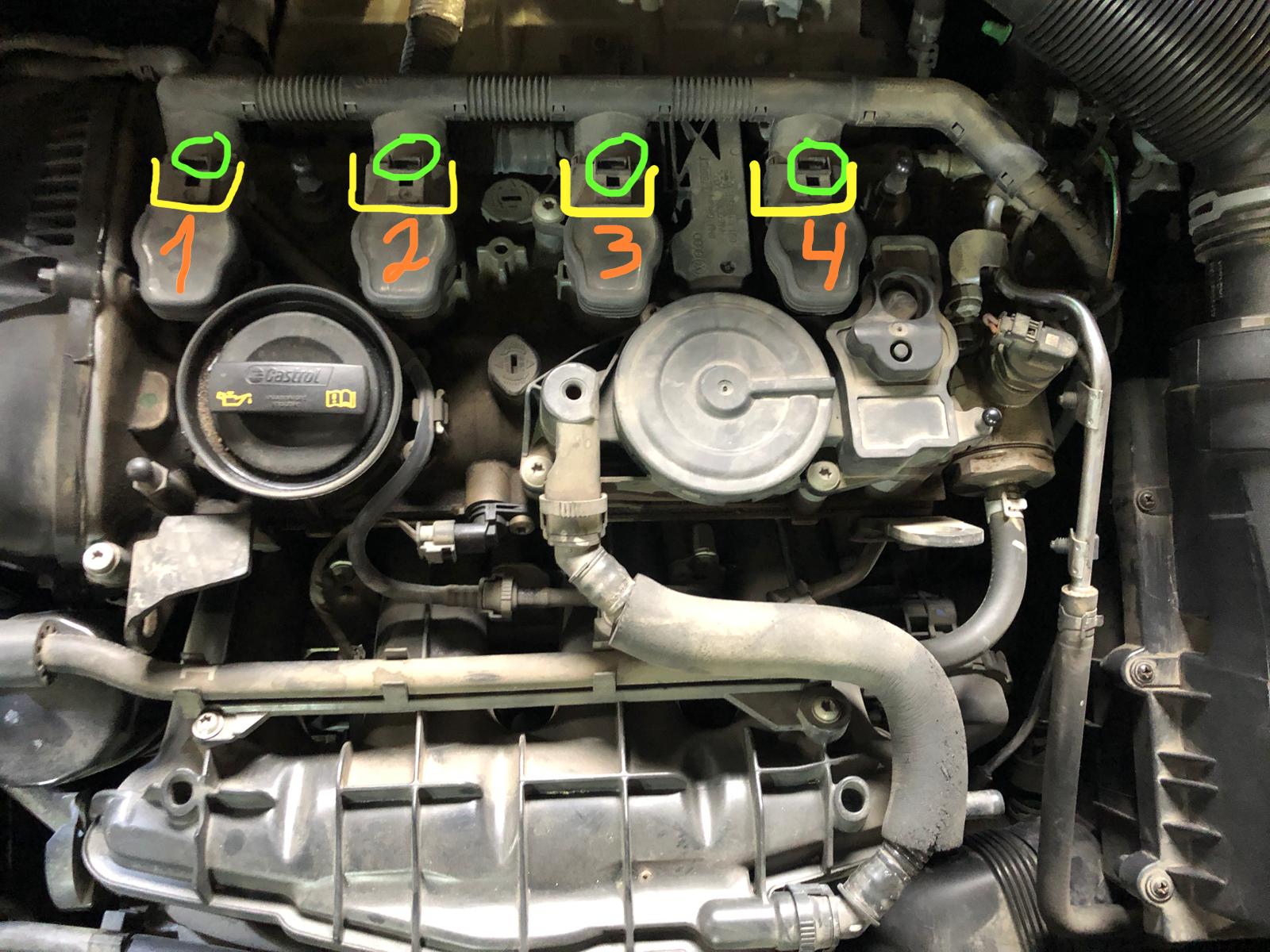 4. כעת יש לנתק את הקונקטורים של 4 הסלילים על ידי לחיצה קטנה על הלשונית (מסומנת בירוק) ומשיכה החוצה. נשחרר את 4 הקליפסים ונסיט אותן טיפה הצידה.