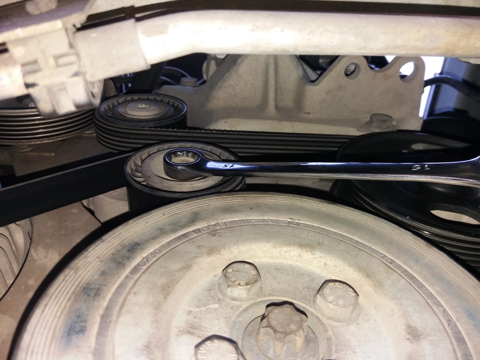 בעזרת ידית רינג 15 נסובב את בורג המותחן עם כיוון השעון ע"מ לשחרר את המתח מהרצועה ונסיר אותה מהמדחס בלבד(אין צורך להוריד אותה לגמרי)