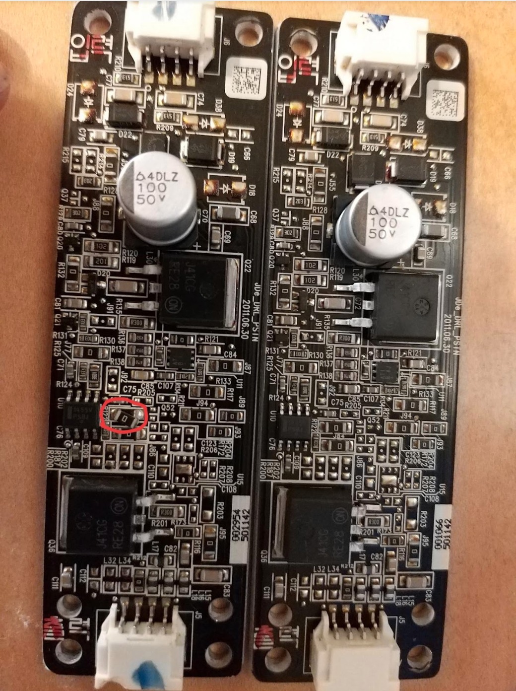 3) צלמו וסימנו את מיקום החיבור של PWR ושל LEDs (לפני הניתוק). תוכלו לזהות זאת ע"י כמות חורים בכל אחד מהצדדים (בצד אחד יש 4 ובצד שני יש 2) או ע"י השווה של מיקום הכבל בלוח.