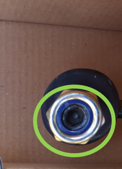 החלק החדש שהורכב הוא מתוצרת טלוסה. מגיע עם אום טפלון/ניילוק (חומר כחול בפנים ההברגה שנועל את האום על הבורג, מסומן בירוק).
