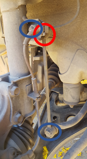 4. מפרקים את המוט הישן על ידי שחרור האומים העליון והתחתון – (מסומן בכחול) ההברגה היא רגילה, נסובב נגד כיוון השעון. לעליון ניתן לגשת בקלות דרך בית הגלגל, לתחתון צריך להישכב מתחת לרכב, ולגשת מכיוון חזית הרכב.
