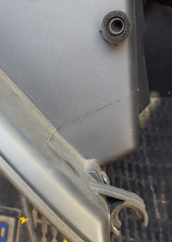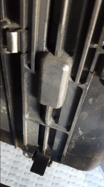 5. הפילטר ממוקם בצד השמאלי, בצורה אנכית בתוך בית מאחורי מכסה פלסטיק (מסומן בכחול)