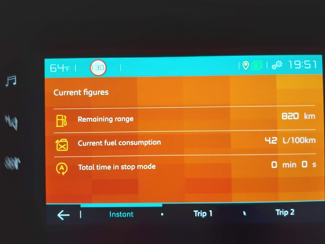 TRIP A, B וצריכה רגעית. בתוכם מוצגים הטווח שנשאר למיכל הדלק, המהירות הממוצעת לטריפ, וצריכת הדלק.